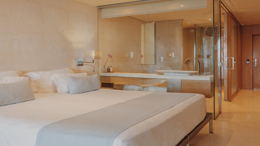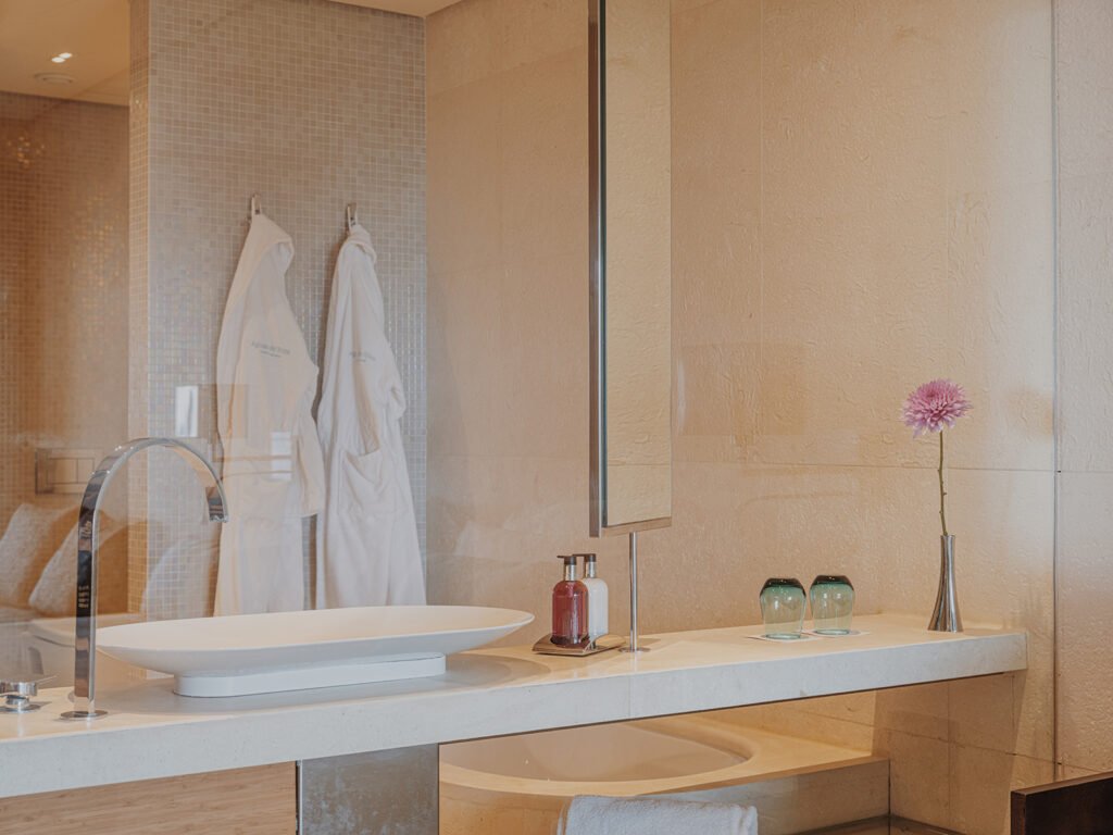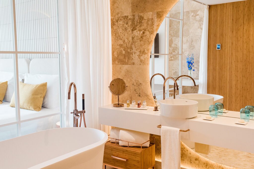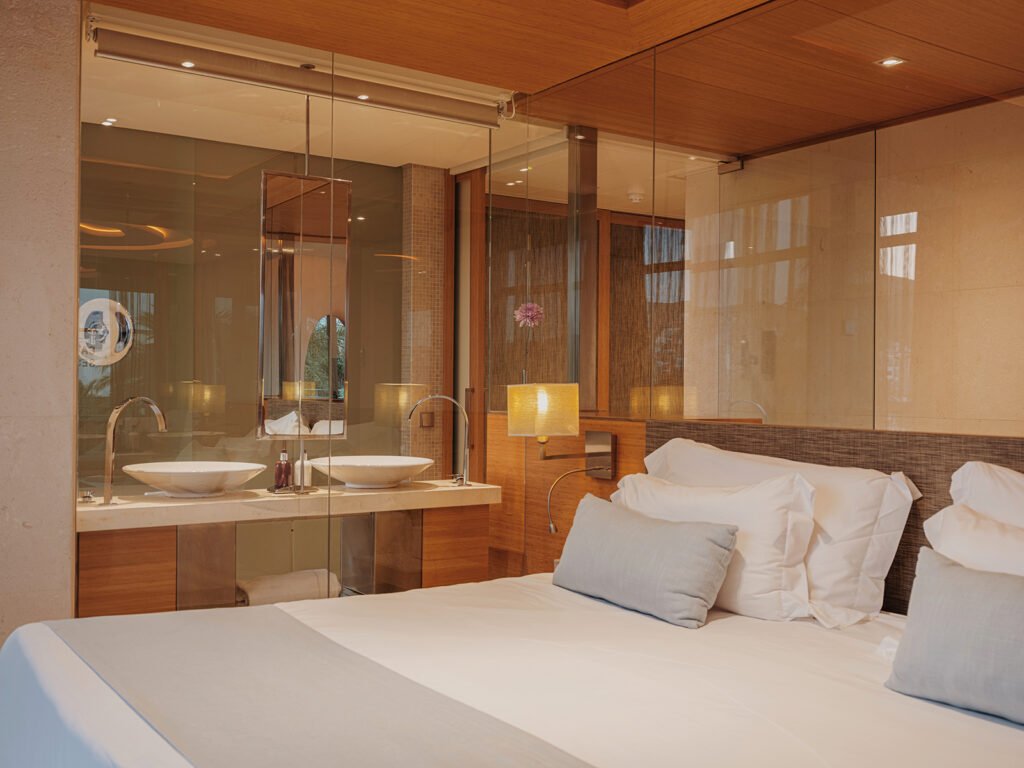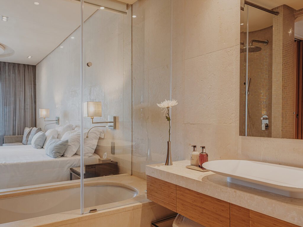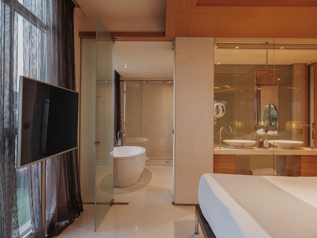Contemporary Mediterranean-style room designed under Feng Shui principles. The interiors feature natural elements to make for a most pleasant experience. The bathroom is lined with natural stone and iridescent tiles that light up with the sun recreating sea shells.