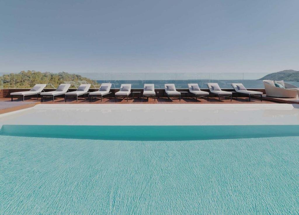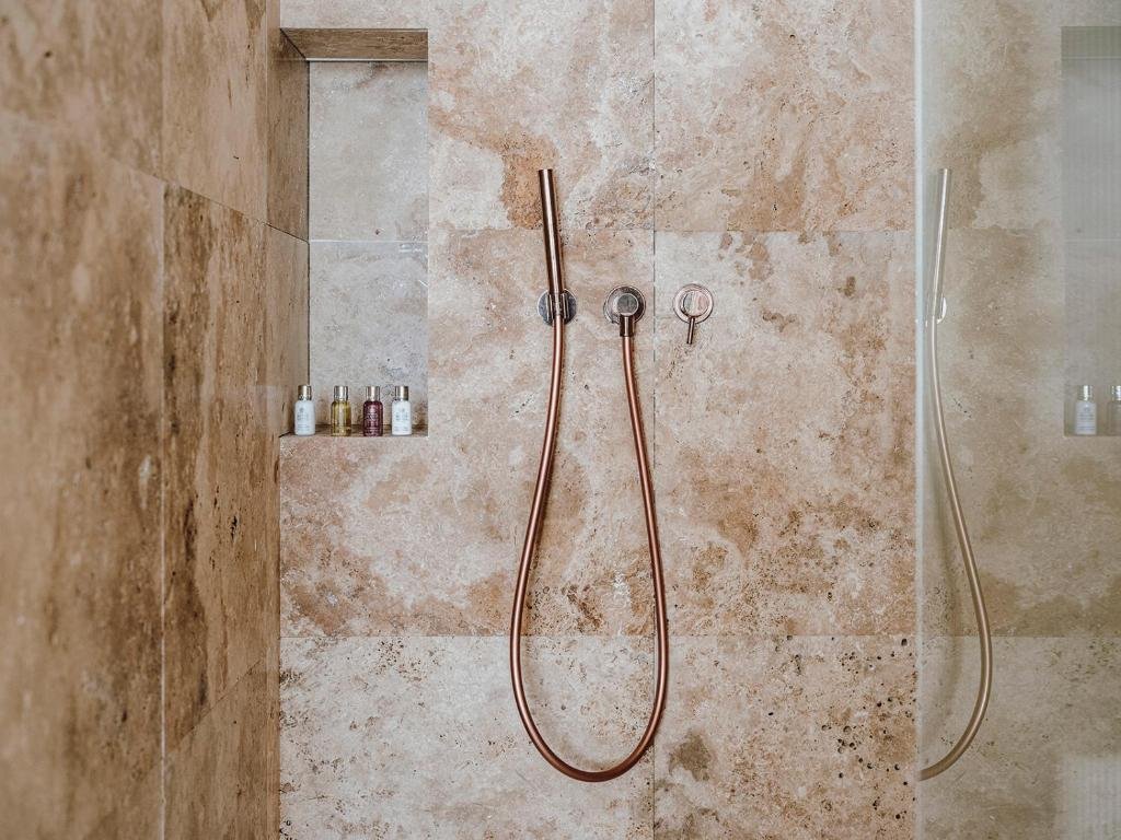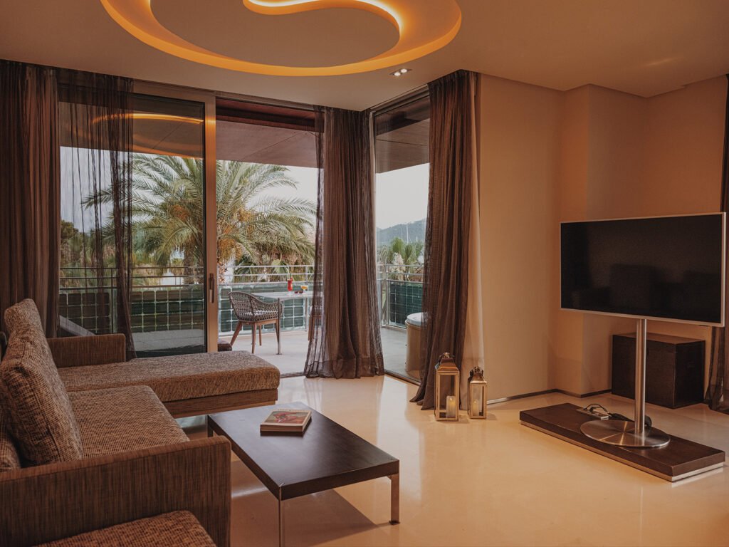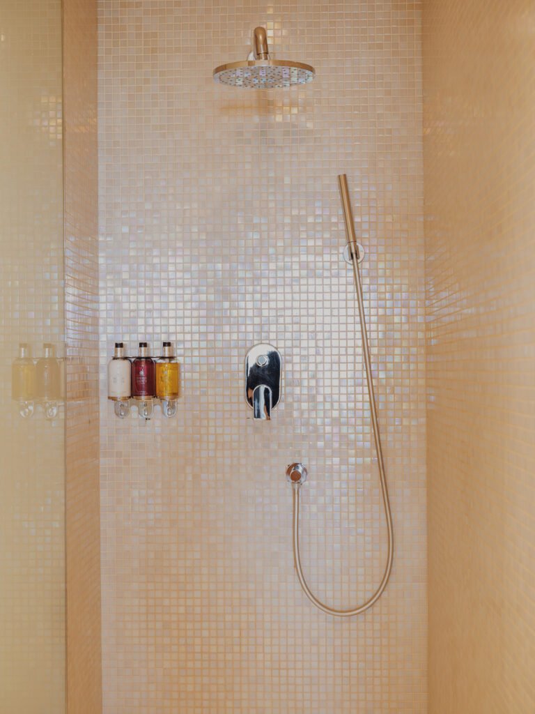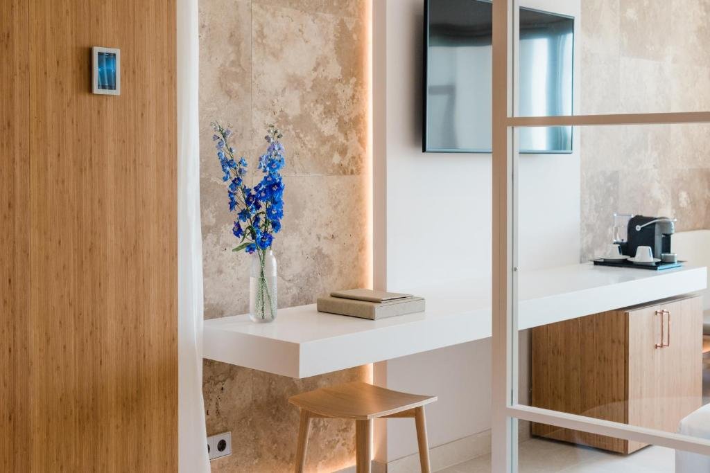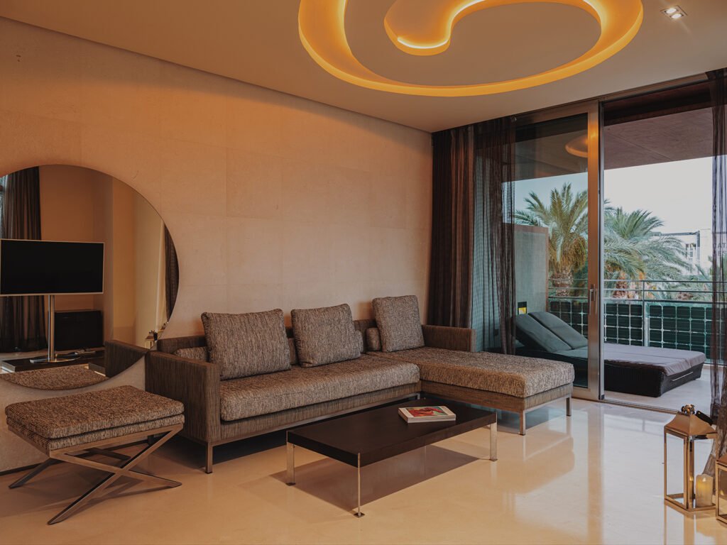 Contemporary Mediterranean-style room designed under Feng Shui principles. The interiors feature natural elements to make for a most pleasant experience. The bathroom is lined with natural stone and iridescent tiles that light up with the sun recreating sea shells.